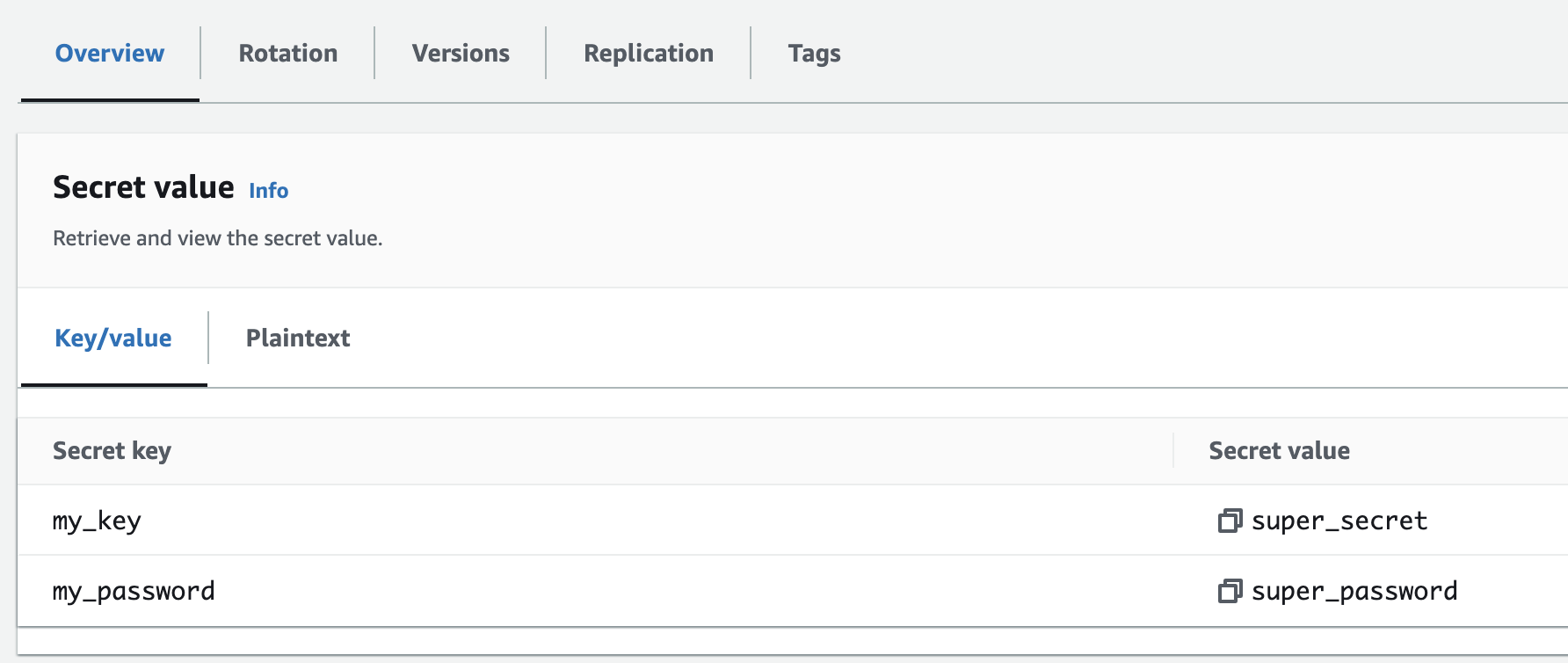 secretsmanager:GetSecretValueRequired. Allows reading secret values.